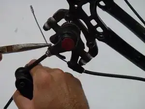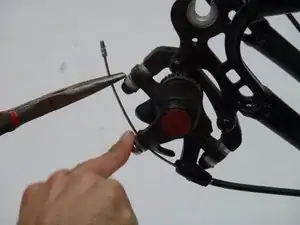 Держась за тормозной кабель, открутите винт, который фиксирует тормозной кабель на месте, с помощью шестигранного ключа на 5 мм.