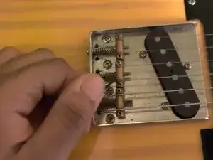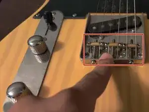 Найдите трест, который находится либо на головке грифа, под пластиной на головке грифа, либо на корпусе в направлении основания грифа.