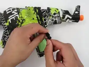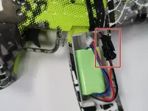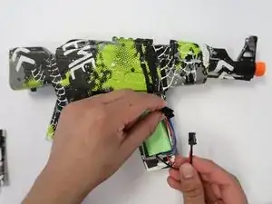 Сожмите обе стороны язычка и разъедините соединитель, чтобы извлечь аккумулятор из мотора гелевого бластера.