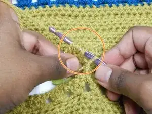 После того как вы закрепили все свободные петли, пришло время заполнить дыру. Присоедините новую пряжу к первой петле на нижнем ряду.