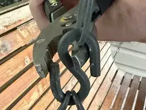 Снимите с крючка цепь, расположенную ближе к задней части качели, после его открытия.