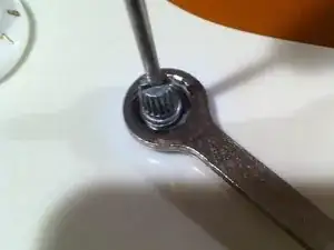 Найдите твёрдую поверхность для следующего шага. Я использовал тряпку, чтобы стабилизировать потенциометр. Обратите внимание на конец шлицевого вала внутри отверстия чёрной пластиковой детали. Он правильно совмещен и только начинает входить в отверстие. Садится очень плотно. Используйте палец, чтобы сильнее надавить, удерживая всё в выравнивании. Требуется большое усилие.