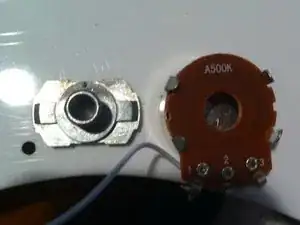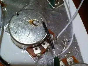 Установите потенциометр обратно в штатное положение на деке звукоснимателя так, чтобы он находился в правильной ориентации на гитаре. Начните заново припаивать все снятые ранее соединения. У меня было два провода для повторного присоединения. Соберите всё так, как было до начала разборки. Смотрите ваши первоначальные фотографии или схему.