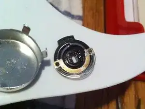 После того как вы извлекли неисправный потенциометр из гитары, положите его на устойчивую поверхность. Сделайте фотографии или зафиксируйте, как всё было собрано, чтобы вернуть в прежнее состояние. Я также сделал отметки для помощи. Отогните назад зацепы, удерживающие конструкцию, как показано на фото.