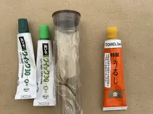 Этот клей называется Quick 30 и продаётся в японских хозяйственных магазинах или на Amazon. Это эпоксидная смола. Прочность клея увеличивается при комбинировании двух типов.