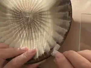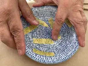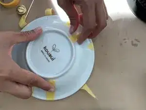 Когда всё на месте, зафиксируйте это скотчем. Для участков, склонных к растяжению наружу, таких как плоские тарелки или миски, закрепите всю длину от одного конца до другого одним куском скотча в нескольких местах.