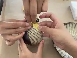 Когда эпоксидная смола слегка подсохнет, начните соединять сломанный держатель. Рекомендуется работать вдвоём для более устойчивой фиксации. Каждый раз закрепляйте washi (малярной) лентой плотно на месте.