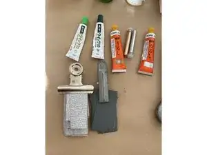Смешайте клеи (две тюбики слева: зелёные крышки) на стеклянной подложке.