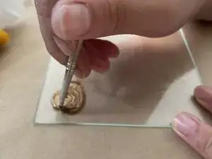 Как описано в предыдущем шаге, аккуратно нанесите смесь лака и золотого порошка поверх эпоксидной смолы.