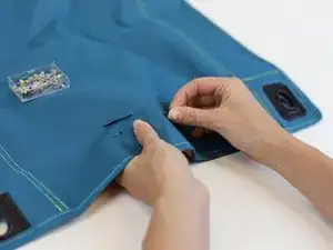 Используйте швейные булавки, чтобы закрепить кусок ткани на месте. Разместите булавки вокруг разрыва, образуя «квадрат» (зелёные линии).
