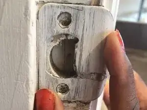 Осмотрите планку защёлки (накладку засовa), проверьте наличие ослабленных винтов так же, как вы делали с петлями.