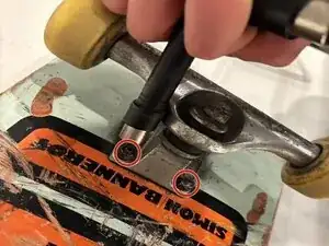 Используйте скейт-ключ, чтобы открутить винты, крепящие траки к доске.