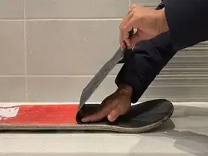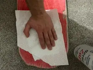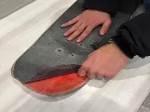 Важное напоминание для шага 5 — убедитесь, что доска полностью высохла перед продолжением. Если доска не высохла должным образом, клей новой наждачной ленты может не приклеиться к доске. Если лента не приклеится правильно, возможно, вам придётся снова ремонтировать доску в будущем.