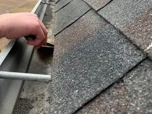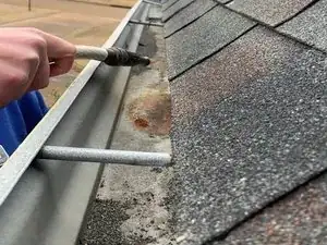 Очистите область вокруг места протечки металлической щёткой или садовой кельмой и ведром: удалите листья и мусор, поместите вынутое в ведро и промойте желоба водой из шланга, чтобы обеспечить чистую поверхность; затем тщательно промойте и высушите область.