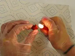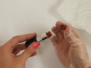 Наденьте перчатку и отделите отколовшуюся часть помады от остальной трубки (только если разлом неровный).