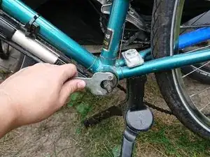На левой стороне (со стороны, противоположной приводу) велосипеда вставьте выемку гаечного ключа для фиксирующей гайки в один из зацепов на фиксирующей гайке.