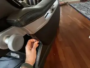 Начните с того, что установите кресло в полностью вертикальное положение. Возможно, потребуется аккуратно подать питание, чтобы переместить кресло для более удобного доступа к крепежу