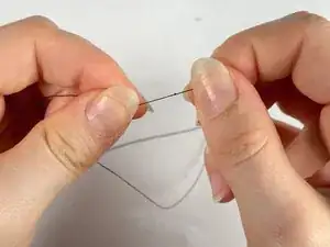 Возьмите другой конец нитки, который не прошел через ухо иглы, сделайте небольшой петлю и пропустите конец нитки через нее.