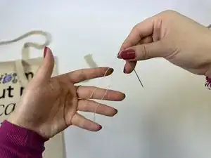 Протяните нитку через ушко иглы, пока два конца нитки не сравняются.