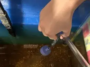 Когда вода начнёт течь из аквариума в ведро, перемещайте пылесос по поверхности гравия, чтобы удалить мусор.