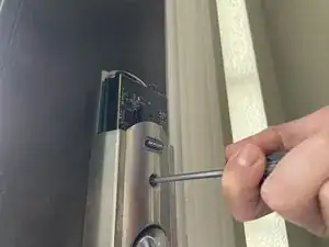 Прикрепите устройство сигнализации обратно к двери, закрутив нижние и верхние винты.
