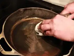 Почистите сковороду губкой, чтобы удалить остатки металлической стружки.