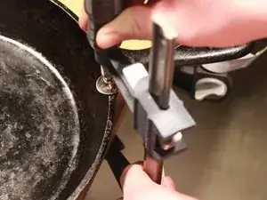Зафиксируйте сковороду за противоположные стороны на столе струбцинами.