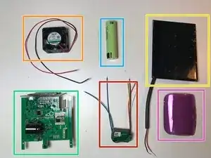 Шесть пластиковых деталей слева направо, сверху вниз: корпус, крышка, держатель вентилятора, держатель солнечной панели, плата PCB и держатель фильтра.