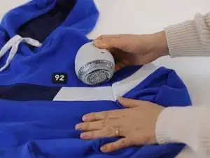 Делайте небольшие круговые движения с лёгким нажимом на повреждённом участке ткани. Машинка будет срезать катышки.