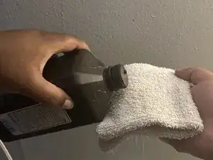 Нанесите небольшое количество перекиси водорода на мягкую тряпку, убедившись, что она влажная, но не пропитанная и не капающая.