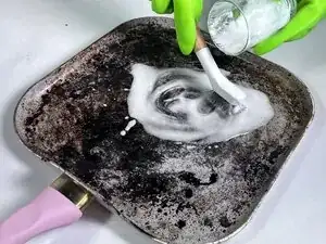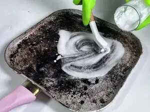 Осторожно потрите сковороду пастой из соды и щеткой круговыми движениями, применяя умеренное давление.