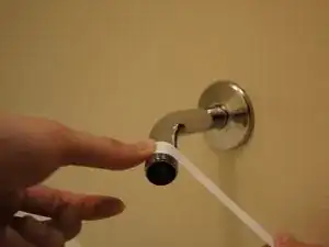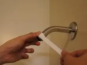 Прижмите один конец ленты к резьбе на конце душевой штанги (трубы, выходящей из стены).