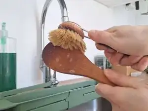 Промойте деревянные кухонные принадлежности под теплой водой с посудным мылом. Хорошо ополосните.