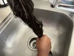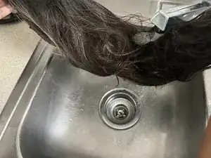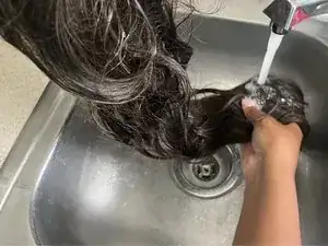 Смойте кондиционер или Silicon Mix с парика тёплой водой, спускаясь снизу вверх.