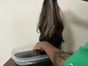 Чтобы парик полностью увлажнился, добавляйте кондиционер до и после погружения парика в ёмкость.