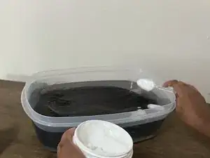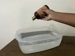 Опустите синтетический парик обратно в чистую воду в ёмкости. Добавьте кондиционер для волос по вашему выбору в ёмкость.