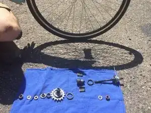 Соберите части подшипников и осевого узла, которые устанавливаются на стороне ступицы, противоположной звезде. Это включает тормозные колодки и конус.