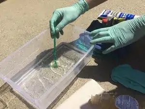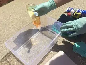 Добавьте немного мыла в воду в пластиковой ёмкости и размешайте.