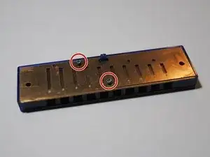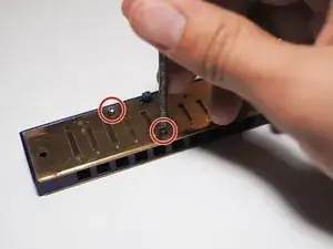 С помощью отвертки с крестовой головкой удалите винты 11 mm Phillips #1 в центре гармони, удерживающие язычковые пластины, и отложите их в сторону.