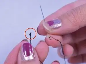 Позвольте игле скользнуть по нитке, пока она не окажется посередине. У вас должны получиться равные по длине концы нитки с обеих сторон иглы.