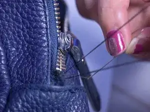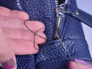 Затем вставьте иглу через другую сторону ткани молнии и затяните крепко, пока не станет надёжно.