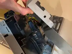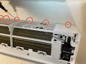 Осторожно потяните вверх за верхнюю часть белого пластикового кожуха, чтобы освободить его от основного корпуса. Сверху находятся шесть маленьких защёлок, которые нужно отжать, прежде чем кожух снимется. После освобождения верхних защёлок отведите белую крышку от стены, одновременно вращая её вперёд (откатывая от стены).