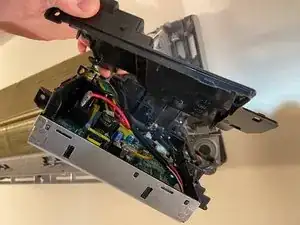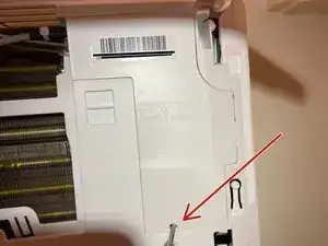 Используйте крестообразную отвертку, чтобы вынуть три винта с передней части блока. Средний винт скрыт под небольшой пластиковой защёлкой (см. второе фото).