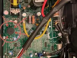 Найдите пьезоизлучатель на основной плате и потяните за верхнюю часть его корпуса пальцами или плоскогубцами с тонкими губками, чтобы снять верхнюю половину излучателя.