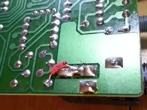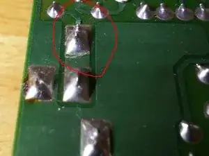 Я припаял перемычку между этими двумя язычками, соединёнными друг с другом, и перекрыл ею зачищенную часть дорожки. Также добавил дополнительный провод, резервирующий эту дорожку.