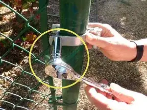 Используя торцевой ключ 1/2" или разводной ключ, закрепите две планки защёлки на внутренней стороне рамы калитки на одном конце.