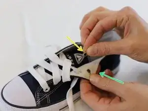 Сначала вытяните шнурок из повреждённого или отсутствующего отверстия для люверса.