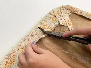 Когда сиденье отделено от основания, переверните его и снимите скобы ткани с помощью плоскогубцев.