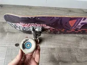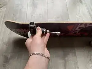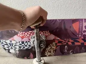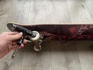 Используя скейтбордный инструмент или ключ, отверните гайку оси над колесом.