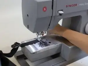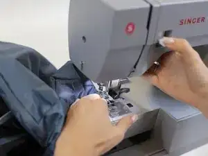 Следуя последнему шагу, продолжайте держать ремень с нижней пряжкой обеими руками и осторожно положите его на швейную машину.